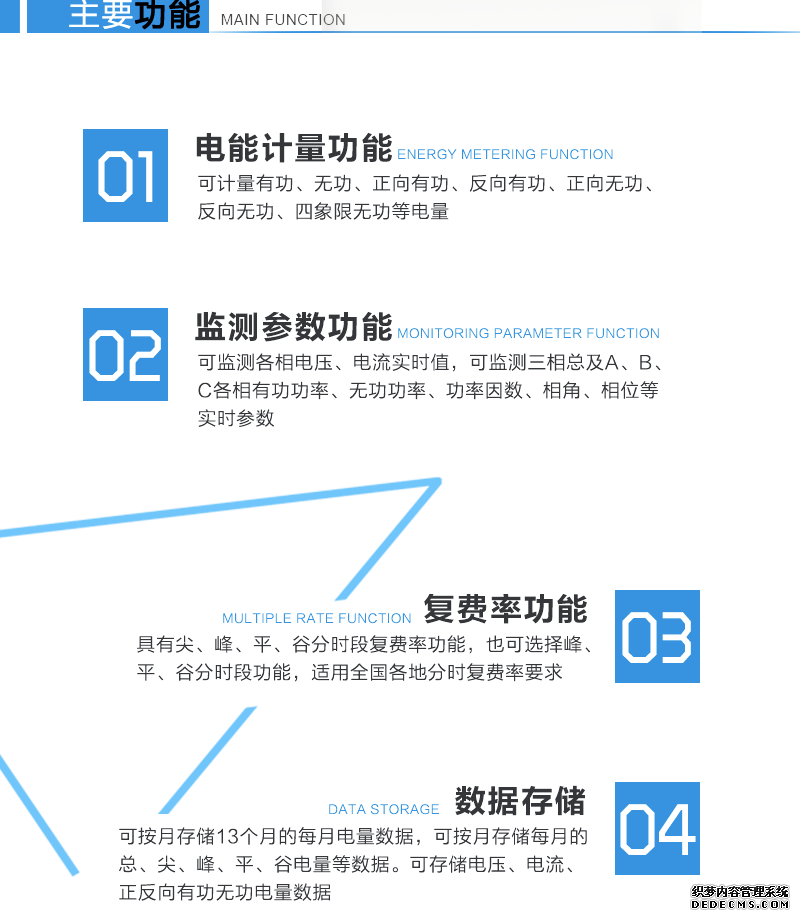 - 主要功能:有功,功率因素,有功功率,無功功能,四象限無功,電壓,電流,事件報警,需量