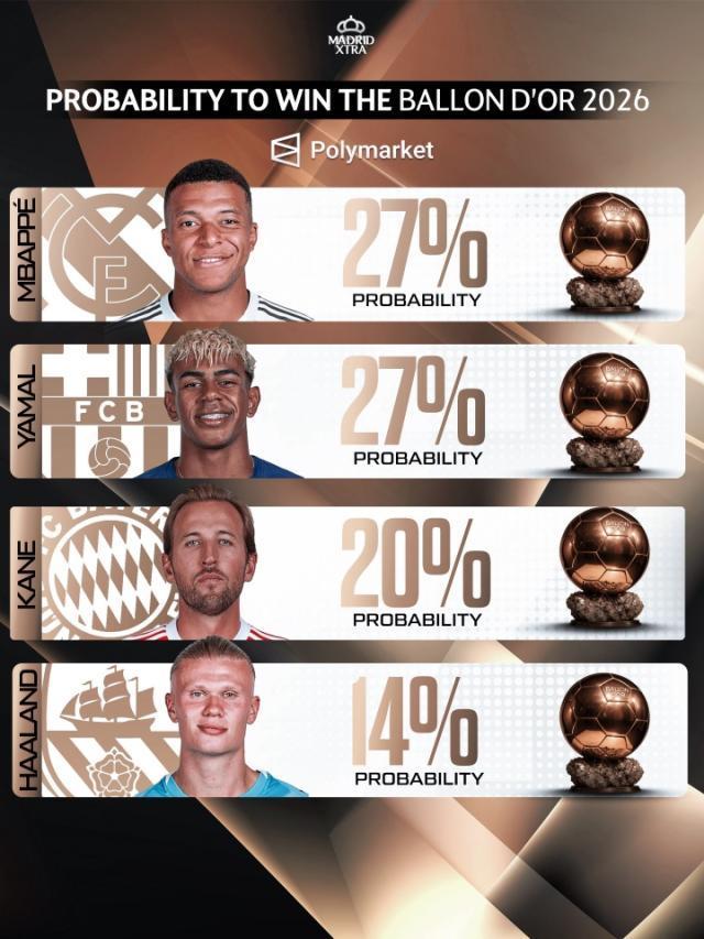 02月04日訊 相關(guān)機(jī)構(gòu)近期更新了2026年金球獎的獲獎概率預(yù)測,目前姆巴佩與亞馬爾并列領(lǐng)跑,兩人獲獎概率均為27%,凱恩和哈蘭德則緊隨其后。